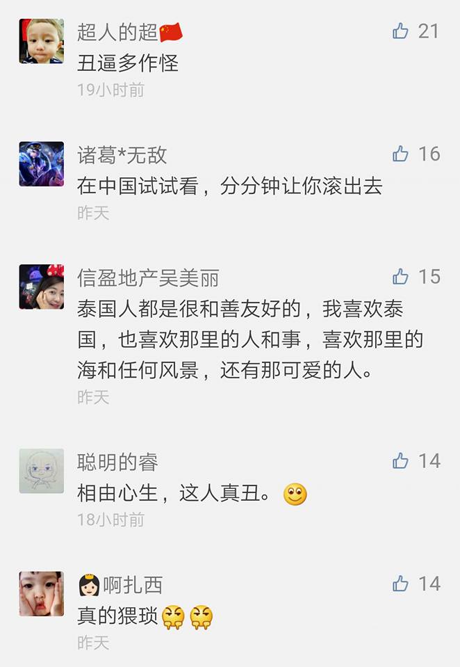 ความคิดเห็นจากชาวโซเชียลจีนส่วนใหญ่เป็นไปในแนวเดียวกันคือ “ตำหนิฝรั่งคนนี้ ว่าแย่มากกับสิ่งที่ทำ” โดยบอกด้วยว่า คนไทยใจดี แต่ใจดีเกินไป คือถ้าทำแบบนี้ควรได้รับการลงโทษ ถ้าเป็นที่จีน คงโดนไล่กลับประเทศไปแล้ว