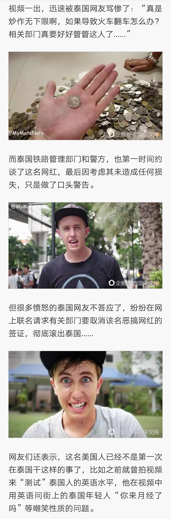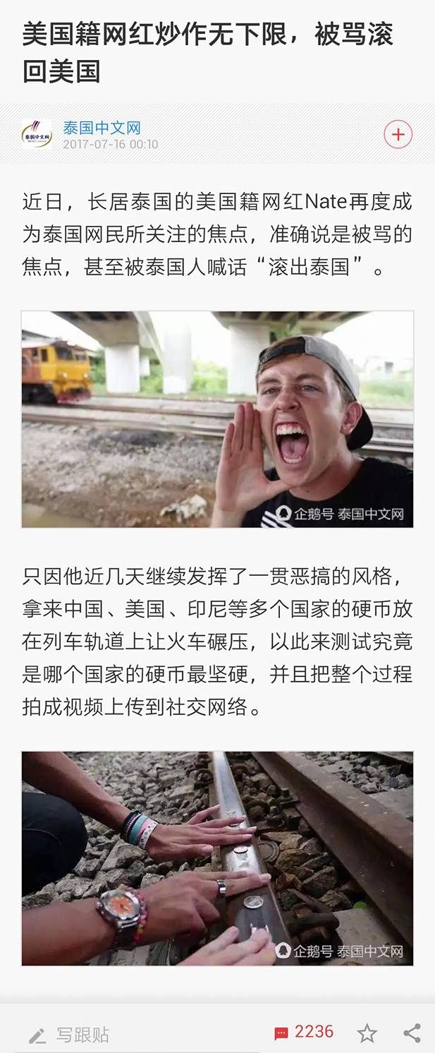 ในโซเชียลจีนตอนนี้ เช่น WeChat, 网易News (163.com) มีสื่อจีนที่นำเสนอเรื่องราวเกี่ยวกับไทย “泰国中文网” ได้นำเสนอเรื่องราวของ ฝรั่ง #mymatenate ที่กำลังเป็นกระแสดังในกรณีวางเหรียญบนทางรถไฟ ซึ่งยังนำเสนอเรื่องราวที่ผ่านมาของฝรั่งคนนี้ที่มีดราม่าในไทยมาหลายรอบ เช่น กรณีถามภาษาอังกฤษคนไทย, กรณีให้แมวเล่นกับแมงป่อง ,กรณีผูกแมวกับลูกโป่งจำนวนมาก