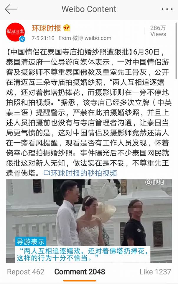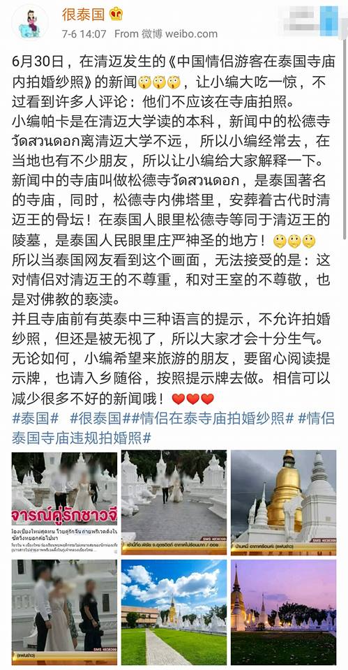 ตั้งแต่เมื่อคืนและวันนี้ ในโลกโซเชียลจีน Weibo มีการนำเสนอข่าว “คู่รักชาวจีนถ่ายรูปพรีเวดดิ้งที่กู่เจ้าหลวง วัดสวนดอก จ.เชียงใหม่”