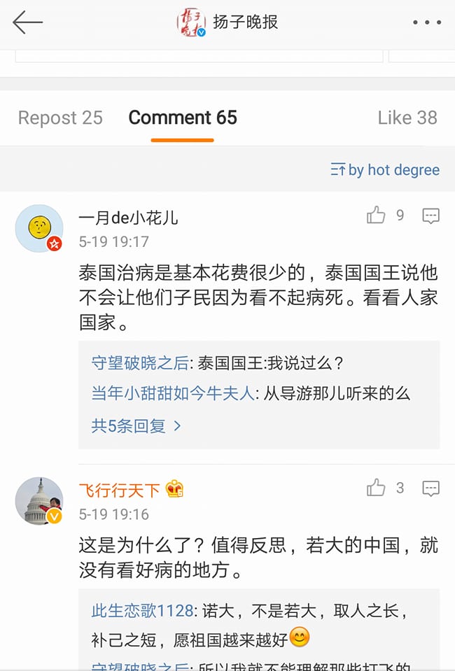 – มีอยู่หนึ่งความคิดเห็นที่ประทับใจมาก เขาคอมเม้นว่า “ค่ารักษาพยาบาลที่ไทยไม่แพงเลย เนื่องมาจากพระราชดำริของพระมหากษัตริย์ของไทย ที่เป็นห่วงทุกข์สุขของประชาชน ต้องการให้ประชาชนได้รับการรักษาพยาบาลอย่างทั่วถึง” — แต่จริงๆ อันนี้ต้องบอกว่า ที่ค่ารักษาพยาบาลในไทยถูกมาก มาจากโครงการ 30 บาท แต่คิดว่าคนจีนคงหมายถึงโครงการแพทย์พระราชทานของในหลวง ร.9 ด้วยครับ