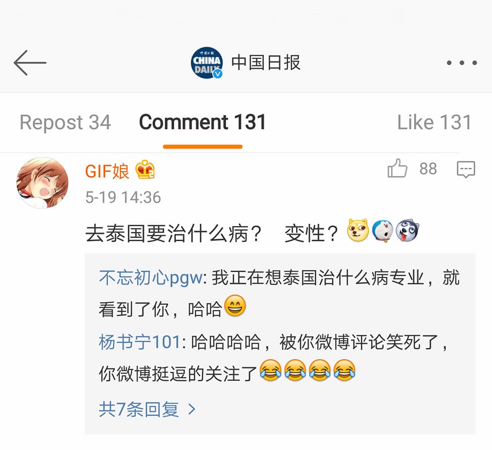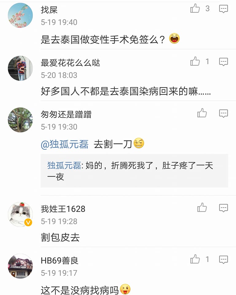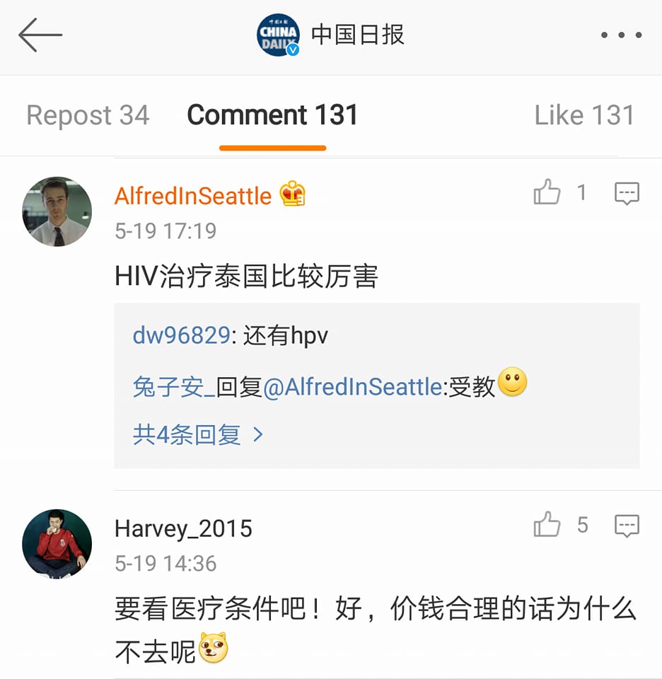 – ส่วนใหญ่มองว่า ที่ไทยเก่งมากด้านแปลงเพศ ดังนั้นจะมารักษาอะไรอย่างอื่นที่ไทยได้อีกบ้าง ซึ่งมีคนเข้ามาตอบว่า “การผ่าตัดปลูกถ่ายอวัยวะที่ไทยคือดีงามมากๆนะ ราคาถูกด้วย” —- ขออธิบายประเด็นปลูกถ่ายอวัยวะนะครับ คือคนจีนใช้คำว่า 移植 ที่แปลว่า transplant การปลูกถ่ายอวัยวะ ครับ อย่าง 心脏移植 ก็ปลูกถ่ายหัวใจ แต่ที่คนจีนนิยมมาทำในไทย จริงๆ คือ 试管移植 ปลูกถ่ายเด็กหลอดแก้ว โดยจากการพูดคุยกับ Dr. Dark พบว่าการปลูกถ่ายอวัยวะในไทย ต่างชาติไม่น่ามาทำได้ เพราะอวัยวะต้องได้จากญาติ แต่ปลูกถ่ายเด็กหลอดแก้ว อันนี้โอเค ยกเว้นมีเรื่องอุ้มบุญมาเกี่ยวครับ