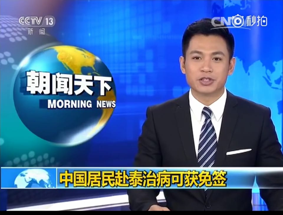 กำลังเป็นที่สนใจในจีนตอนนี้เลย เมื่อสถานีโทรทัศน์จีนช่อง CCTV นำเสนอข่าว “ทางการไทยเปิดฟรีวีซ่าให้คนจีนพร้อมผู้ติดตามอีกไม่เกิน 4 คน เดินทางไปรักษาพยาบาลที่ไทยได้ ไม่ต้องมีวีซ่า โดยอยู่ไทยครั้งละไม่เกิน 90 วัน ต่ออายุวีซ่ารวมแล้วไม่เกิน 1 ปี”