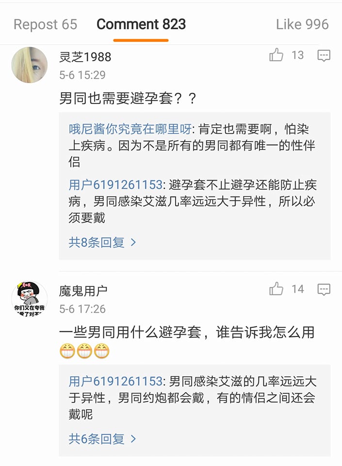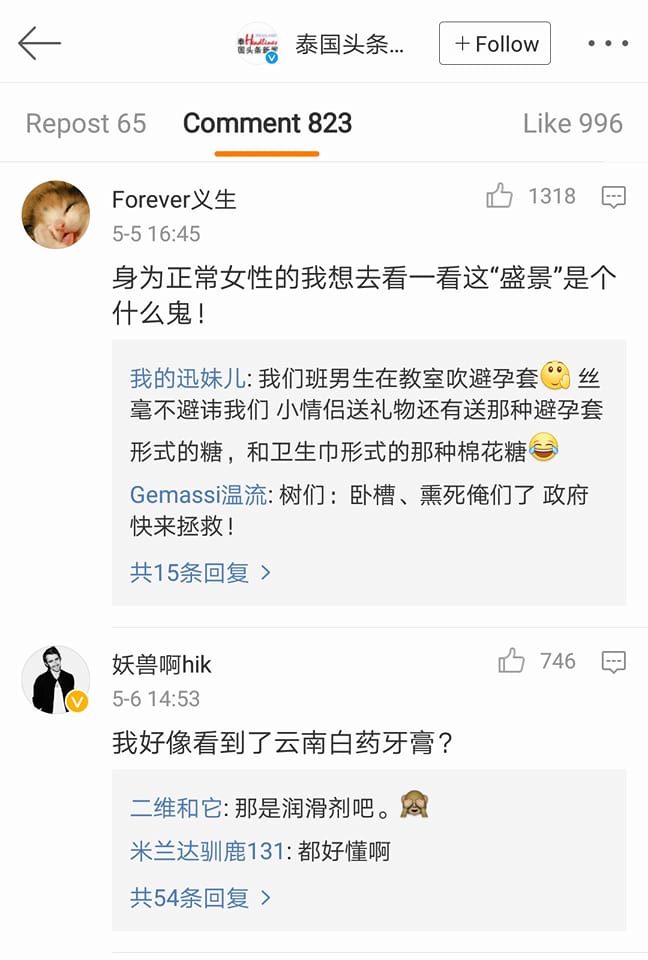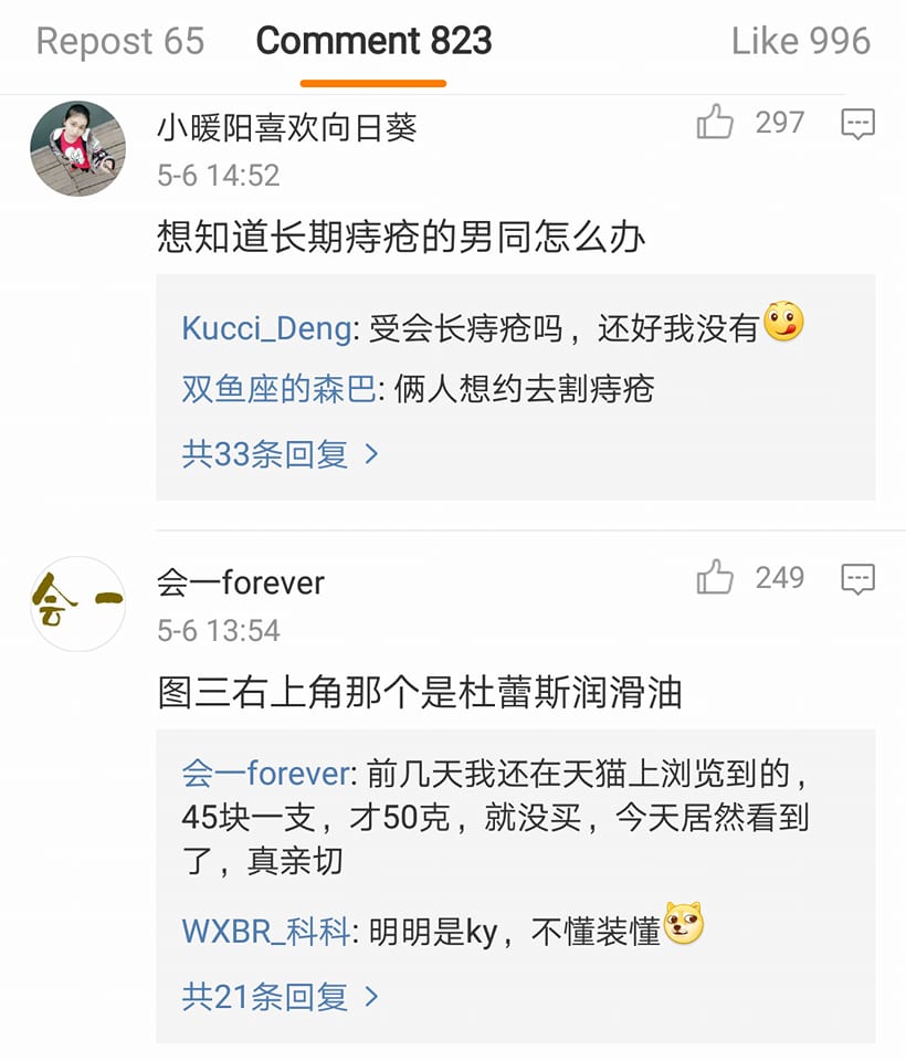 ชาวโซเชียลจีนร่วมแสดงความคิดเห็นมากมาย เช่น “นั่นที่เราเห็นหลอดขาวๆ มันใช่ยาทาริดสีดวงไหมอ่ะ (คือข่าวในจีนบอกว่า คู่รักร่วมเพซ ชาย-ชาย มาปฏิบัติภารกิจที่นี่)” ,”นั่นมันหลอดเจลหล่อลื่นนี่” ,”เฮ้ยยย ถ้าแบบว่าเป็นริดสีดวง ไม่เจ็บแย่เลยหรอ กลางป่าเลย” โดยมีคนจีนจำนวนไม่น้อยตั้งคำถามว่า “รักร่วมเพศ ชายชาย ต้องใช้ถุงยางอนามัยด้วยหรอ?” ก็มีคนเข้่ามาตอบ ให้ความรู้เรื่องเพศศึกษากันไป