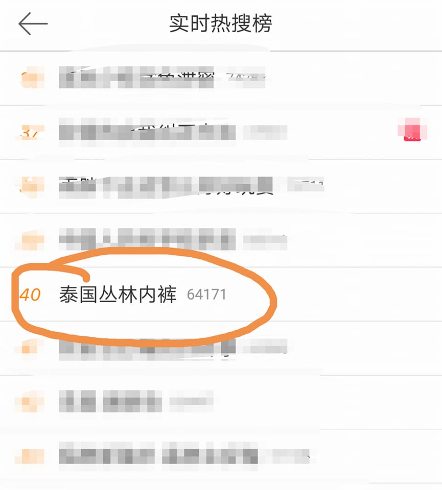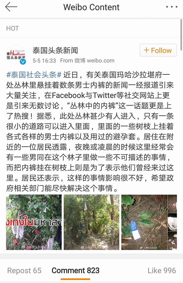 เรื่องราวของป่ากางเกงในที่จ.มหาสารคาม ตอนนี้ถูกเผยแพร่ในโลกสังคมออนไลน์ของจีน และกลายเป็นกระแส แชร์กันในวงกว้าง จนคำค้น “泰国丛林内裤 ป่ากางเกงในประเทศไทย” ติดคำค้นยอดฮิตใน Weibo