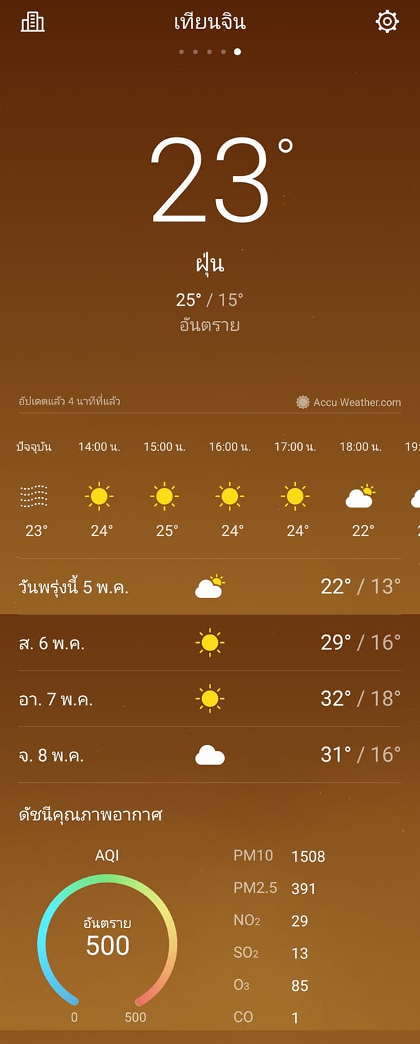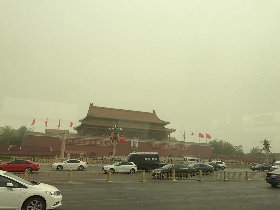 สภาพอากาศที่ปักกิ่ง เข้าขั้นวิกฤติ ค่าวัดปริมาณฝุ่นละองในอากาศ PM10 (ฝุ่นละอองที่มี ขนาดเส้นผ่าศูนย์กลางตั้งแต่ 10 ไมครอนลงมา) ช่วงเช้าที่วัดได้ แตะไปถึงระดับ 1,000 ไมโครกรัมต่อลูกบาศก์เมตร (ล่าสุดอ้ายจงเช็ค อยู่ที่ 959) ส่วนเมืองข้างเคียงอย่าง เทียนจิน วิกฤติเช่นกัน วัด PM10 ได้ 1,508