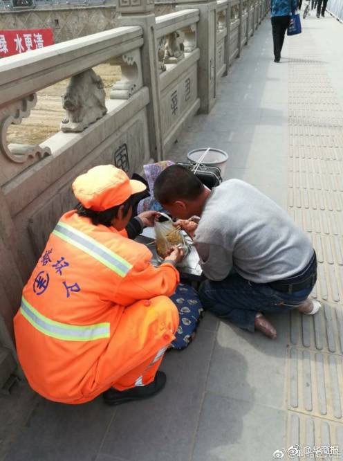 วันที่ 3 เมษายน 2560 มีเหตุการณ์อันอบอุ่นใจเกิดขึ้นที่ สะพานเหยียนเหอ เมืองเหยียนอัน มณฑลส่านซี เมื่อคุณป้า “จางชิ่งเหมย” พนักงานกวาดถนนวัย 58 ปี ป้อนข้าวให้กับหนุ่มพิการบนสะพาน