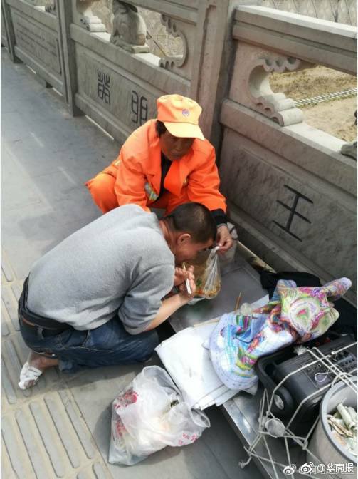“ฉันเป็นมือให้กับคุณเอง” คุณป้าพนักงานกวาดถนนวัย 58 ปี ช่วยเหลือชายจีนผู้พิการมือและเท้าให้ได้กินข้าว ที่นั่งขายของบนสะพาน