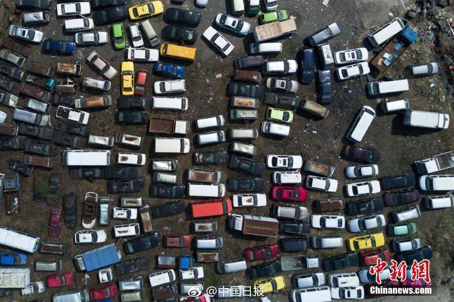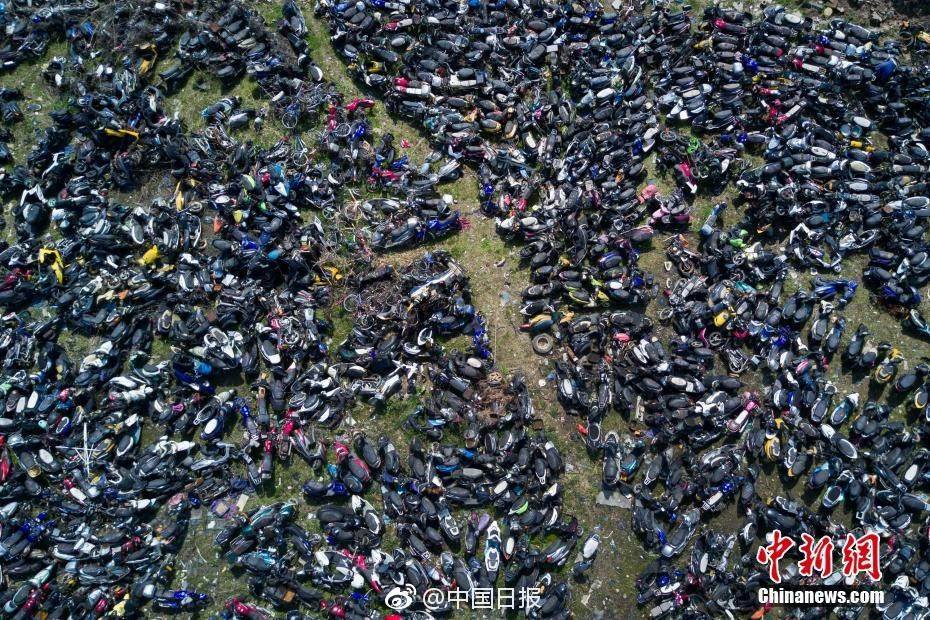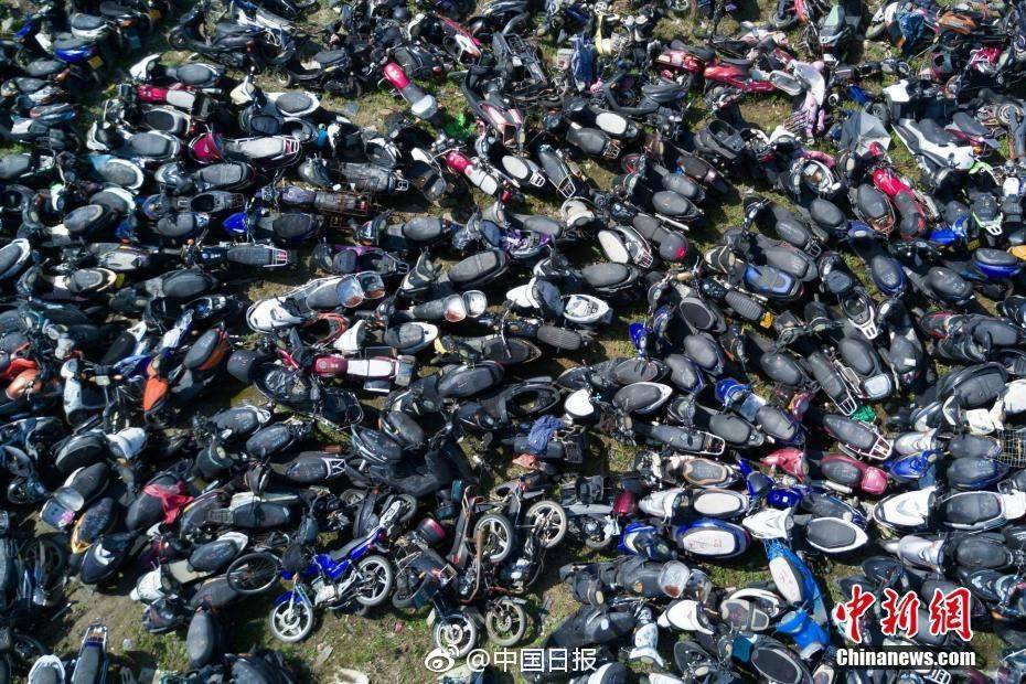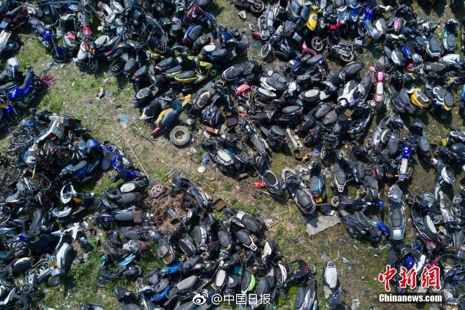 ภาพถ่ายทางอากาศ พื้นที่แห่งหนึ่งในเขตเจียงเป่ย เมืองหนานจิง ที่เสมือนเป็นสุสานของมอเตอร์ไซค์ไฟฟ้า และรถยนต์ ที่ถูกทิ้งเอาไว้จนแน่นพื้นที่