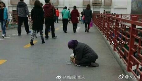 แบบนี้ก็ได้หรอ? ขอทานจีนคนหนึ่ง บนสะพานลอยในย่านช้อปปิ้ง “เสี่ยวจ้าย” เมืองซีอาน ทิ้งป๊อปคอร์นทั้งถุง ที่ผู้หญิงคนหนึ่งซื้อมาให้ ..ลงถังขยะ และเลือกที่จะเก็บแต่เงินเอาไว้