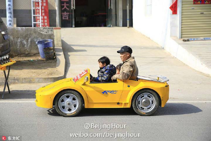 โดยคุณปู่ได้สร้างรถยนต์ไฟฟ้าไซส์มินิให้กับหลานชายทั้งสิ้น 4 คัน เริ่มจากคันแรกที่ให้เป็นของขวัญวันเกิดเมื่อสามปีที่แล้ว โดยแต่ละคันใช้งบประมาณในการสร้างประมาณ 5,000 หยวน (ประมาณ 25,000 บาท)