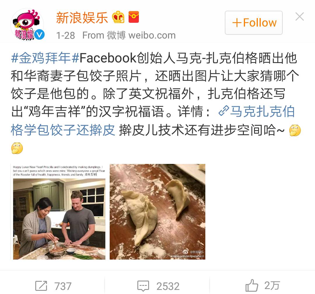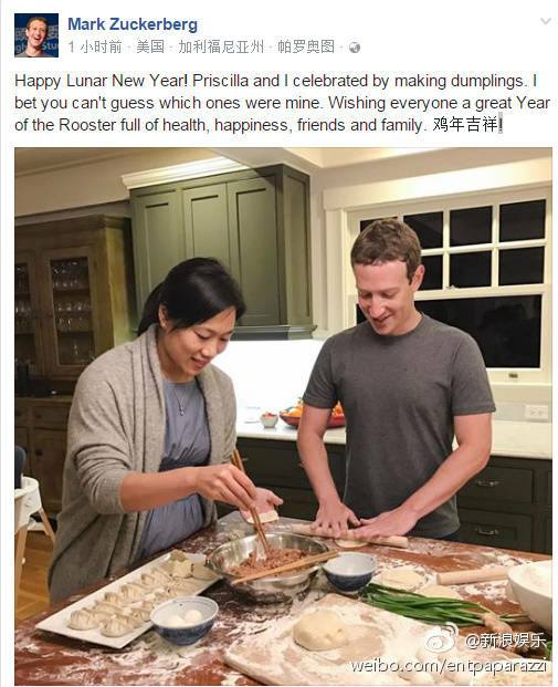 เจ้าพ่อ Facebook ที่ห่อเกี๊ยวร่วมกับภรรยา ในคืนวันสิ้นปี 28 มกราคมที่ผ่านมา ซึ่งเขาโพสต์โชว์ใน Facebook และเขียนข้อความให้ทายว่า เกี๊ยวอันไหนคือเกี๊ยวที่มาร์กห่อ? พร้อมภาษาจีนว่า “鸡年吉祥” โชคดีปีไก่