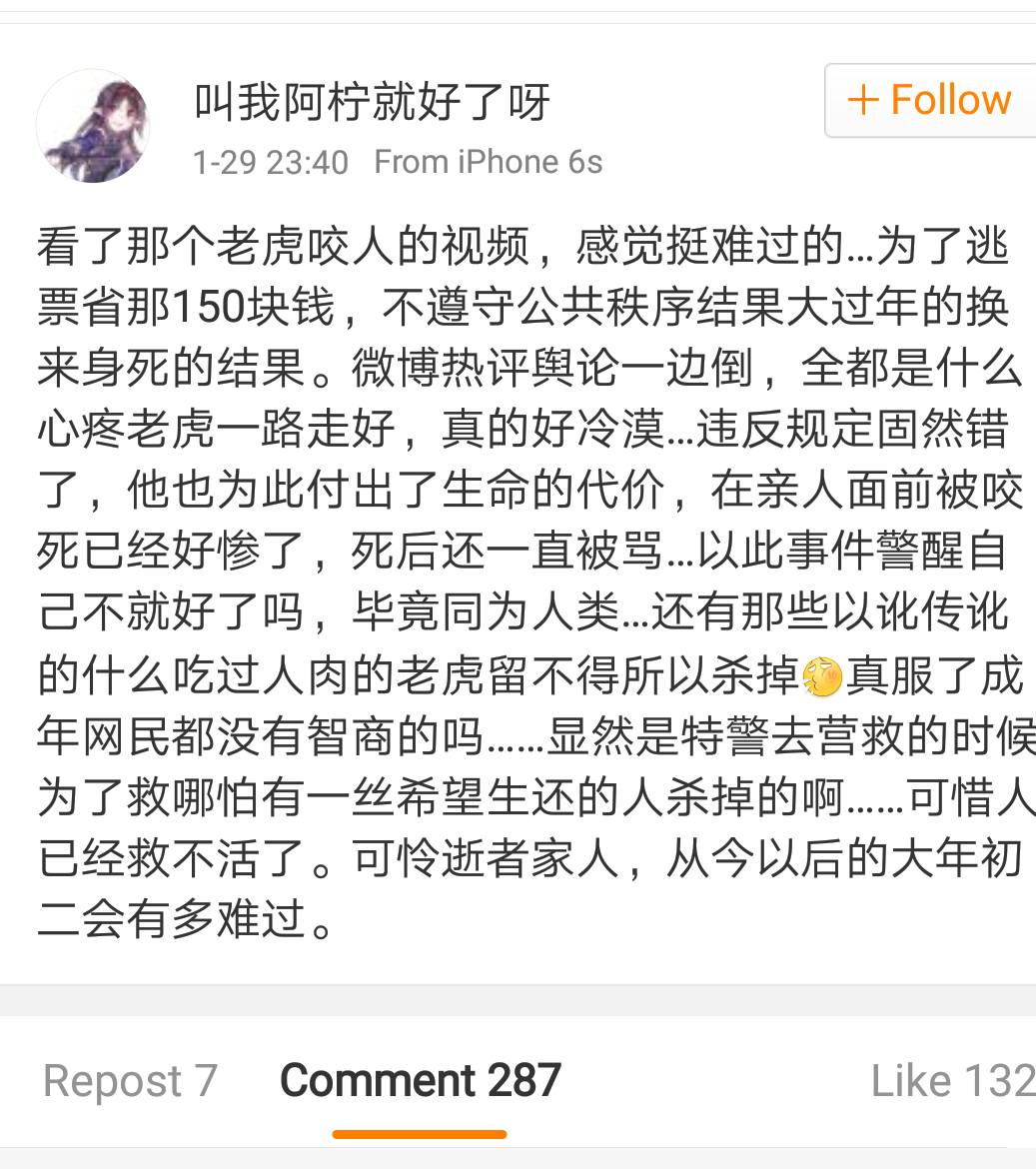 ชาวโซเชียลจีนต่างแสดงความเห็นว่า “เจ้าเสือไม่น่ามาตายแบบนี้ เป็นเพราะความไร้วินัยของมนุษย์แท้ๆ และเหตุการณ์ที่แอบปีนเข้าสวนสัตว์ จริงๆก็มีอยู่บ่อยครั้ง ไม่ว่าจะเสียชีวิตหรือไม่ ก็ควรแก้ไขได้แล้ว”