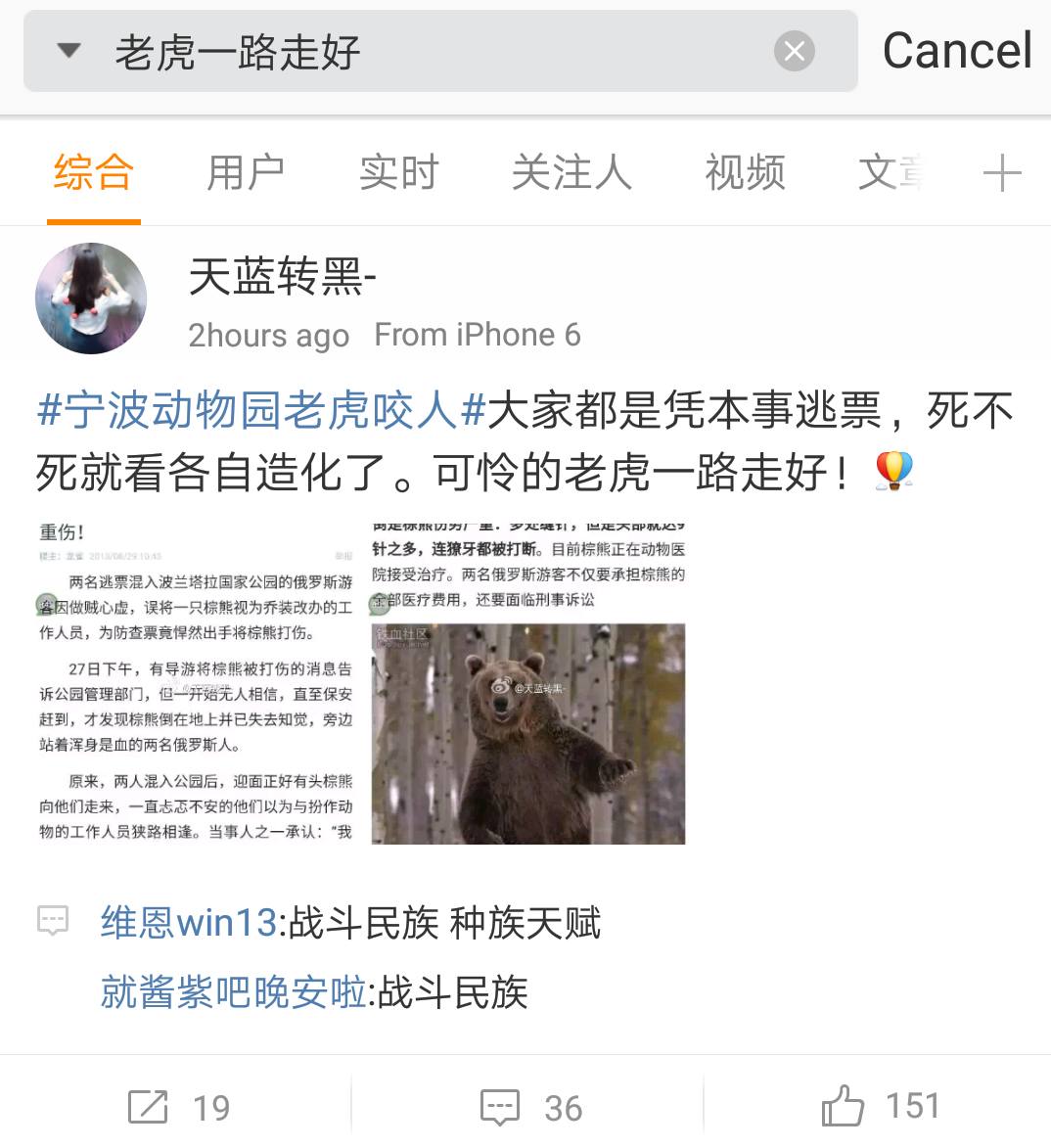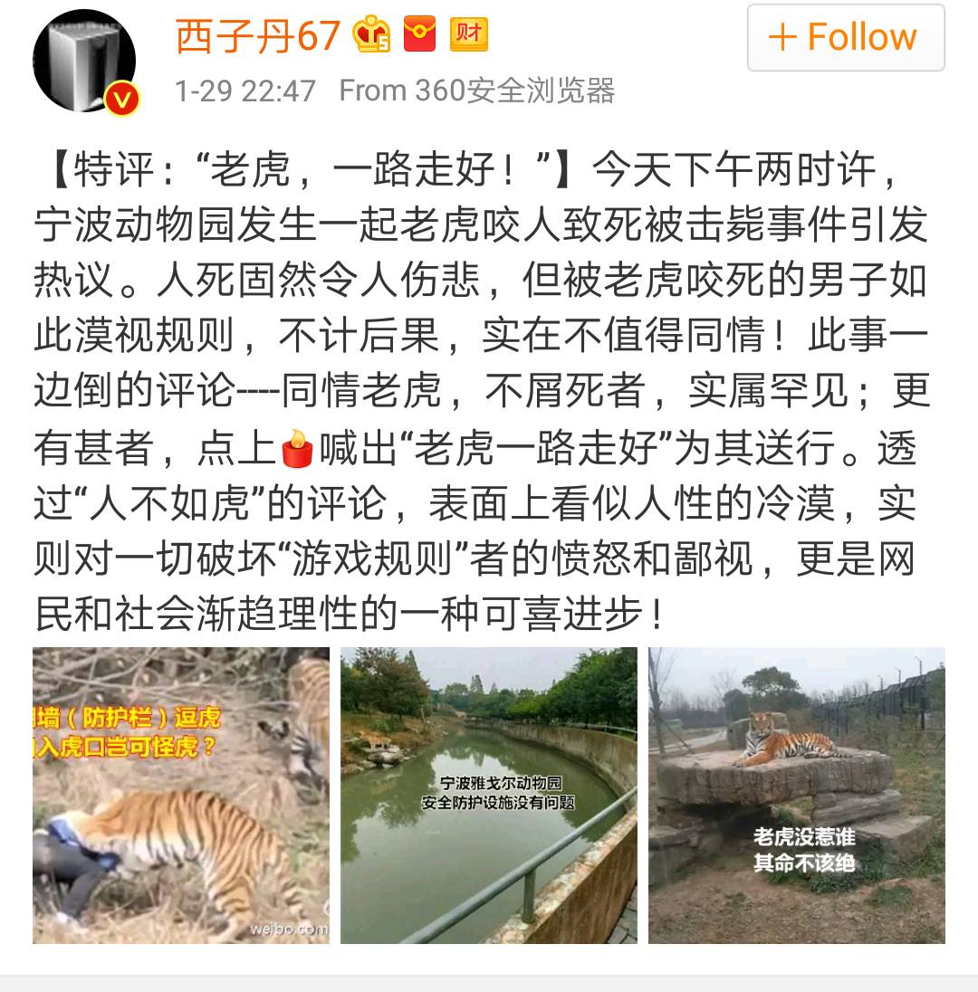 ชาวโซเชียลจีน แห่ค้นหาคำค้น “老虎一路走好” -หลับให้สบายนะเจ้าเสือ ซึ่งกลายมาเป็นคำค้นยอดฮิตใน Weibo …หลังเหตุการณ์เสือกัดชายชาวจีนที่แอบปีนเข้ามาสวนสัตว์ จนเสียชีวิต โดยเสือตัวนั้นถูกเจ้าหน้าที่ยิงจนตายด้วยเช่นกัน