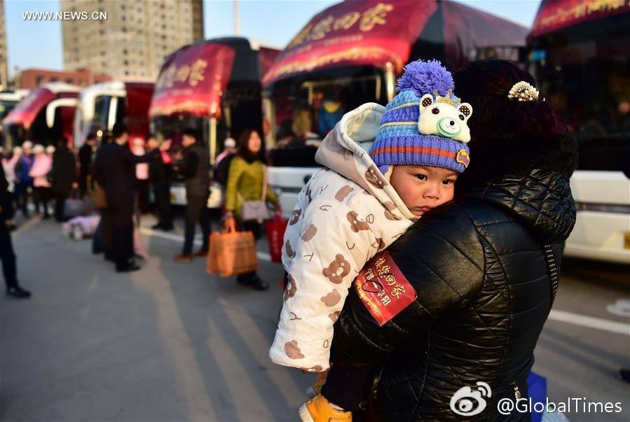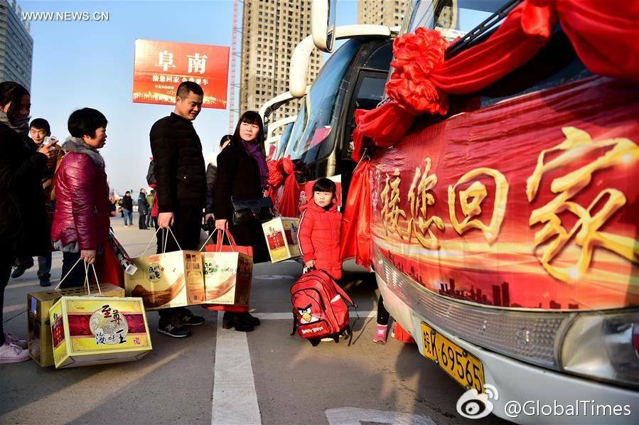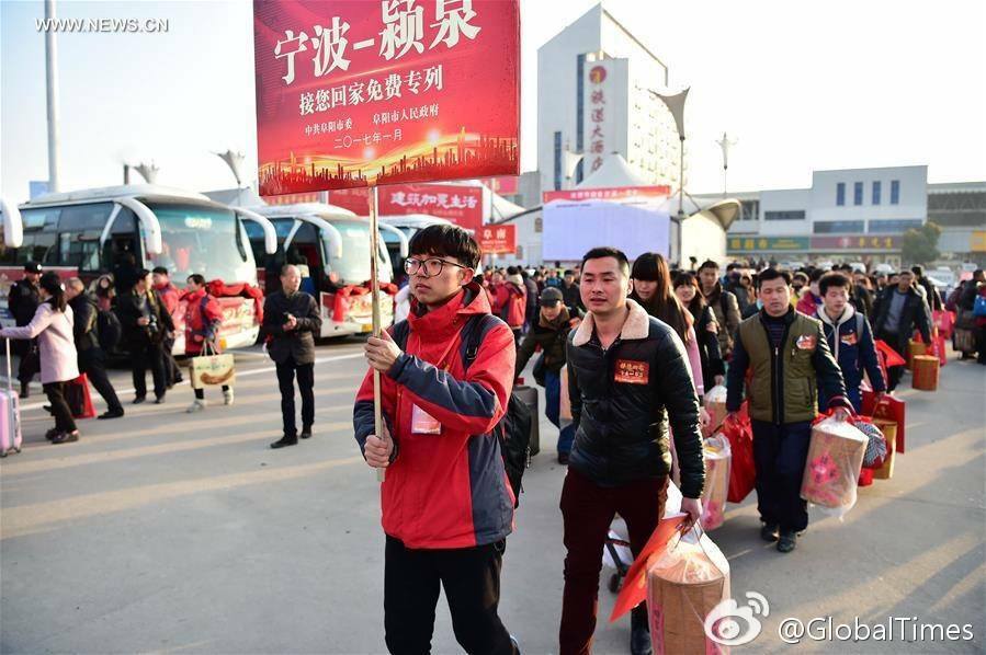 จีนจัดรถบัสให้บริการฟรี ณ สถานีรถไฟเมืองฟู่หยาง มณฑลอันฮุย…สำหรับส่งชาวจีนที่ต้องจากบ้านเกิดมาใช้แรงงานต่างถิ่น กลับบ้านในเมืองต่างๆ เพื่อฉลองตรุษจีนที่กำลังจะมาถึง