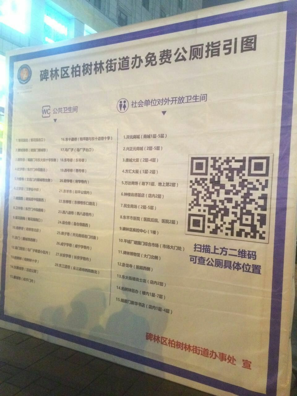 เมืองซีอาน ที่เพิ่งได้รับแต่งตั้งจากทางการจีนให้เป็นเมืองผู้นำห้องน้ำจีน …ได้ติดตั้งป้ายขนาดใหญ่ตามย่านสถานที่สำคัญ เพื่อแสดงจุดที่ตั้งของห้องน้ำสาธารณะและห้องน้ำที่เตรียมเอาไว้ให้บริการฟรีตามย่านต่างๆในซีอาน และเมื่อเราสแกน QRCode เราสามารถเห็นแผนที่แสดงจุดที่ตั้งห้องน้ำสาธารณะและห้องน้ำที่ให้บริการฟรีในย่านนั้นได้ทันที (ดังรูปที่ 3)