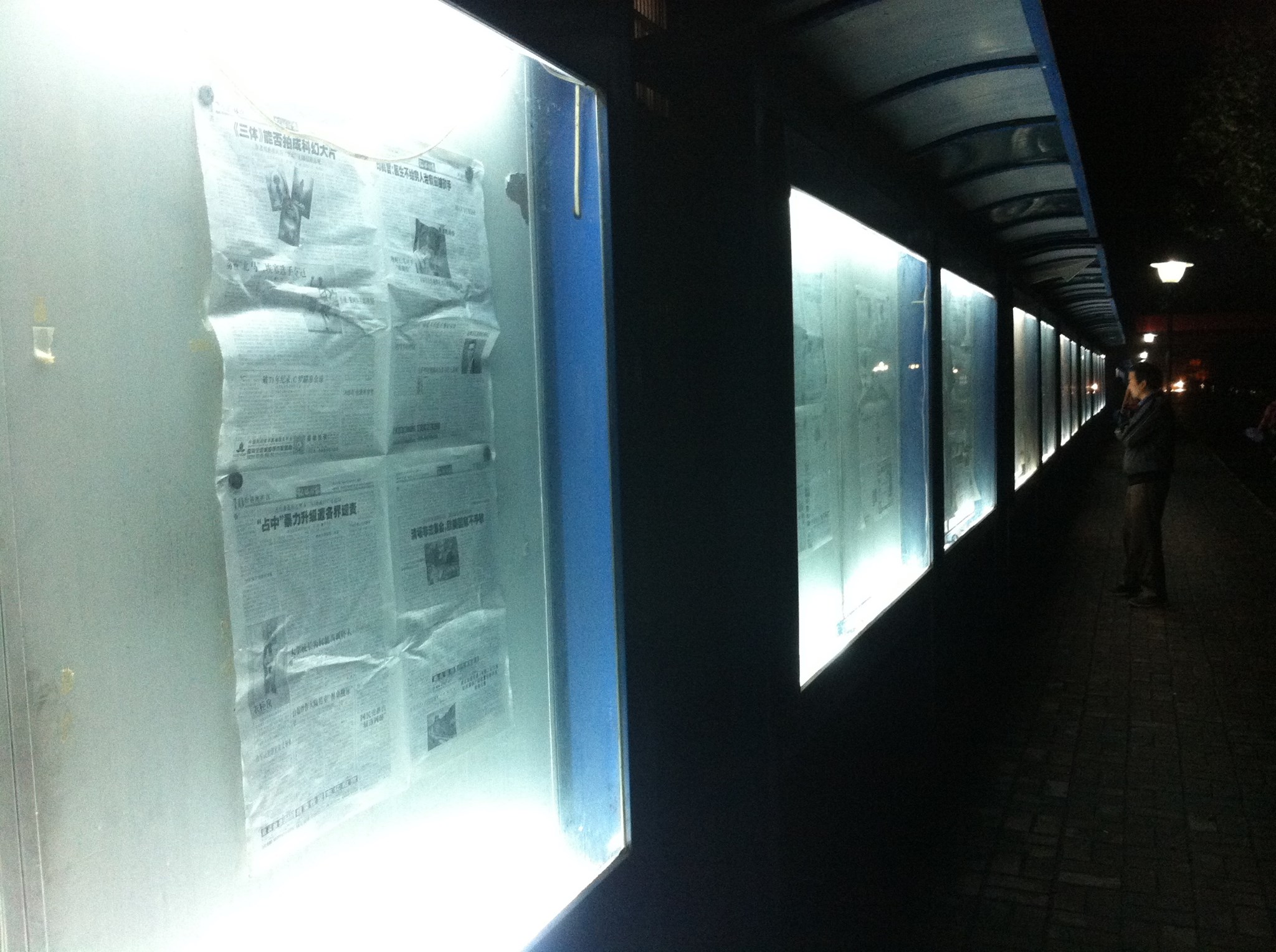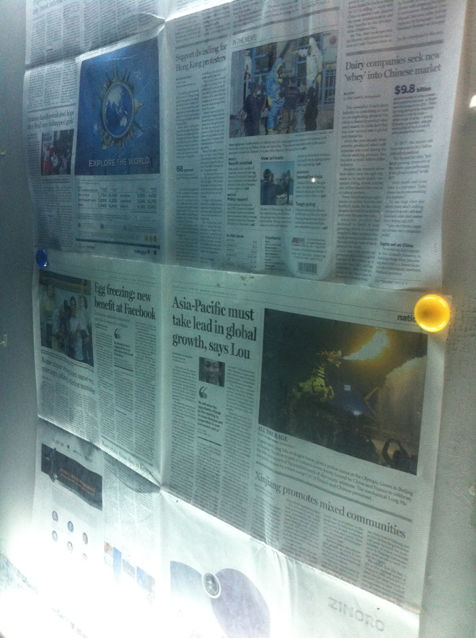 “ความรู้อยู่รอบตัวเรา” ,,,ภายในมหาวิทยาลัยของจีน นอกจากบอร์ดติดประกาศข่าวประขาสัมพันธ์ของ ม. , ประกาศรับสมัครงาน และประกาศอื่นๆ ,,,ยังมีการแปะหนังสือพิมพ์แบบอัพเดทวันต่อวัน ให้ได้ติดตามข่าวสาร อย่างในรูปนี้ มีทั้งหนัวสือพิมพ์ฉบับภาษาจีนและภาษาอังกฤษ,,, เพราะแม้ว่าโลกจะแปรเปลี่ยนเข้าสู่ยุคไฮเทคแล้ว ,,,แต่หนังสือพิมพ์ ยังคงเป็นสื่อที่สามารถเข้าถึงได้ทุกที่ ทุกกลุ่มคน…