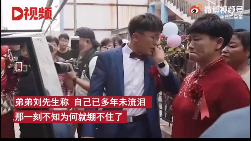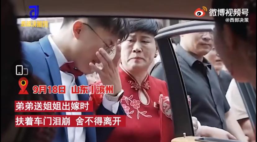 โลกโซเชียลจีนแช่คลิปเรื่องราวชายหนุ่มคนหนึ่งในเมืองปินโจว มณฑลซานตง ประเทศจีน ร้องไห้ไม่หยุด ขณะส่งพี่สาวขึ้นรถเจ้าบ่าว ในพิธีแต่งงาน ซึ่งชายขาวจีนผู้นี้เผยว่า “ไม่ได้ร้องไห้แบบนี้มาหลายปีแล้ว และไม่คิดว่าจะร้องไห้ในงานพี่สาวของตน แต่พอเปิดประตูรถ ส่งพี่สาว กลับร้องไห้ออกมาโดยไม่รู้ตัว รู้สึกไม่อยากให้พี่สาวไปไหน หรือต้องห่างกัน”