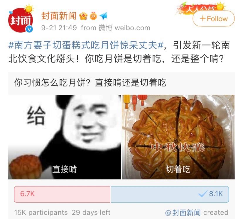 อย่างไรก็ตาม ตอนนี้มีเพจบน Weibo ได้ทำโพลสำรวจความคิดเห็นเรื่องนี้ ว่าสรุปแล้ว “กินขนมไหว้พระจันทร์แบบไม่หั่น หรือ หั่น (ไม่ระบุว่าเป็นคนภาคไหน พื้นที่ไหน ทุกคนตอบได้หมด) ปรากฏว่า เมื่อเวลา 22.25 ของวันที่ 21 กันยายน 2564 เสียงส่วนใหญ่ 8,100 คน เลือก กินแบบหั่น ขณะที่อีก 6,700 คน เลือก ไม่หั่น