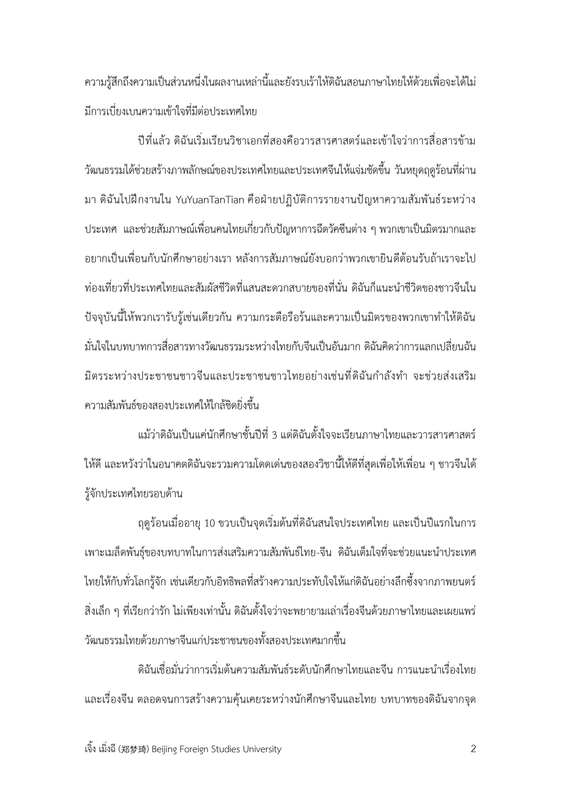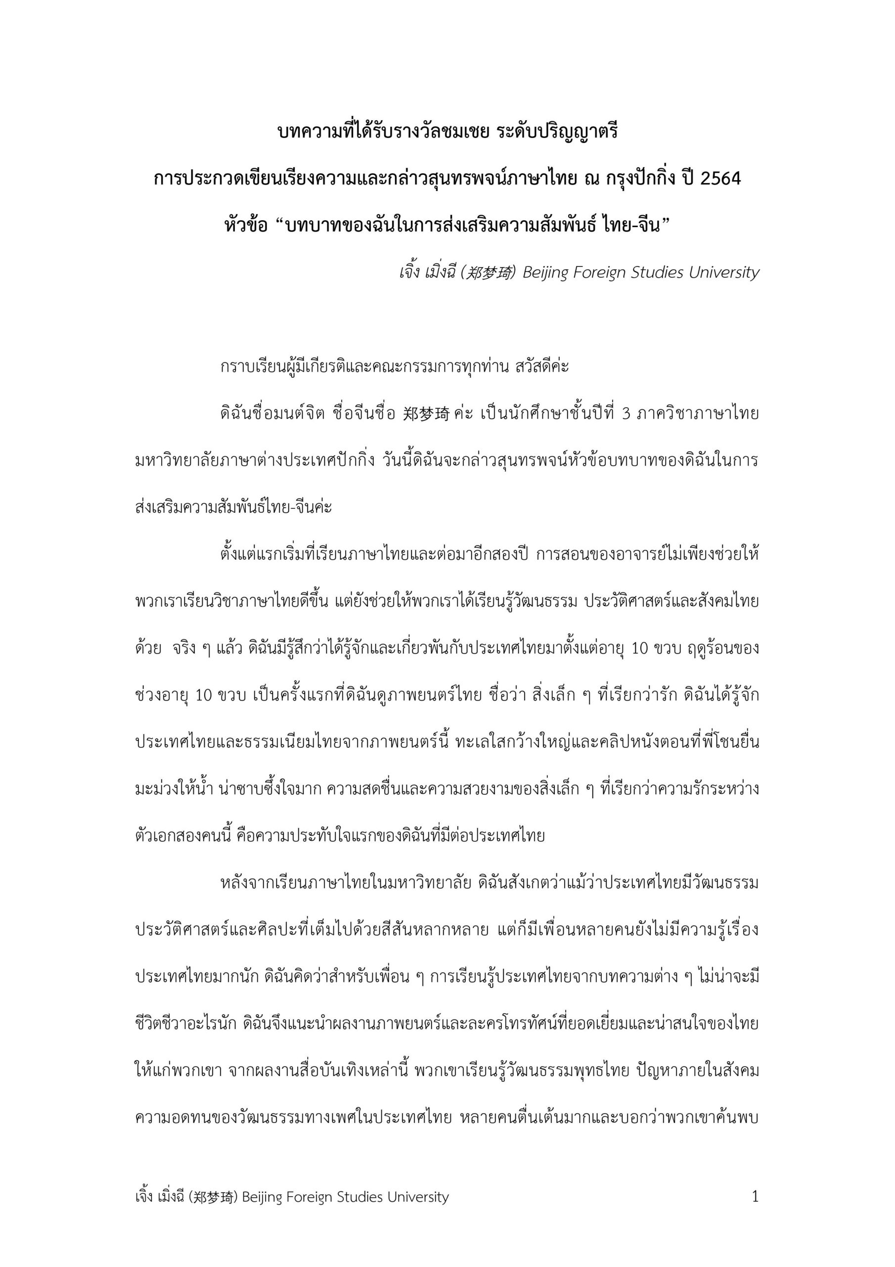 “บทบาทของฉันในการส่งเสริมความสัมพันธ์ ไทย-จีน” | เจิ้ง เมิ่งฉี (郑梦琦)