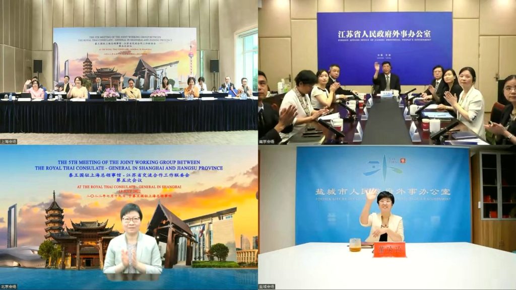 วันที่ 19 กรกฎาคม 2565 สถานกงสุลใหญ่ ณ นครเซี่ยงไฮ้ เป็นเจ้าภาพการประชุมคณะทำงานไทย – เจียงซู ครั้งที่ 5 โดยมีนางสาวลดา ภู่มาศ กงสุลใหญ่ ณ นครเซี่ยงไฮ้ เป็นประธาน ร่วมกับนายหวง ซีเฉียง (Huang Xiqiang) ผู้ตรวจราชการ ชั้น 1 สำนักงานการต่างประเทศ มณฑลเจียงซู
