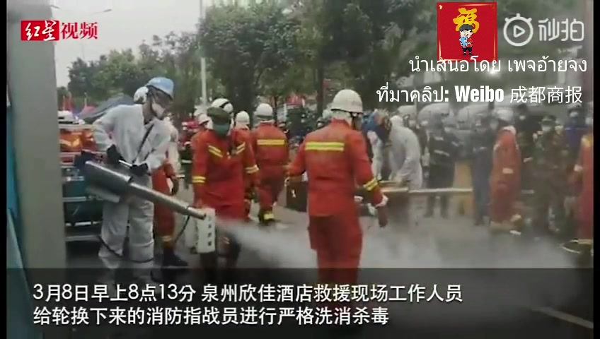 เจ้าหน้าที่ทีมดับเพลิงกู้ภัยที่ลงพื้นที่ช่วยเหลือผู้ที่ติดอยู่ในเหตุโรงแรมในเมืองฉวนโจว มณฑลฝูเจี้ยน ถล่มลงมา เมื่อช่วงค่ำของวันที่7มี.ค.63) ยังคงเคร่งครัดในมาตรการป้องกันและควบคุมการแพร่ระบาดCOVID-19 ด้วยการพ่นน้ำยาฆ่าเชื้อทำความสะอาดชุด-เสื้อผ้า