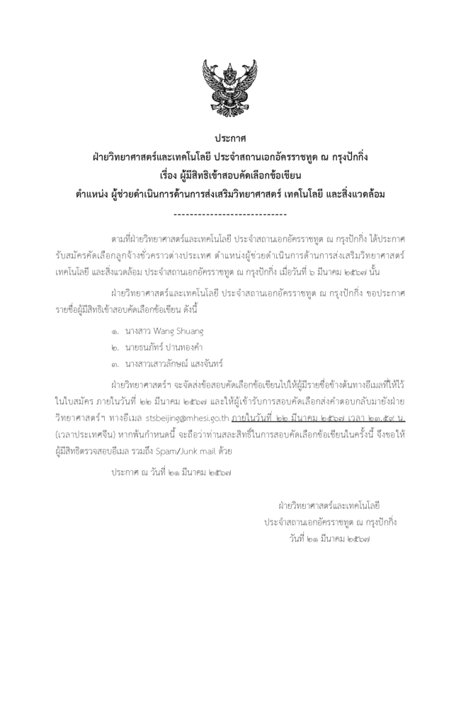 ประกาศ เรื่อง ผู้มีสิทธิเข้าสอบคัดเลือกข้อเขียน ตำแหน่งผู้ช่วยดำเนินการด้านการส่งเสริมวิทยาศาสตร์ เทคโนโลยี และสิ่งแวดล้อม