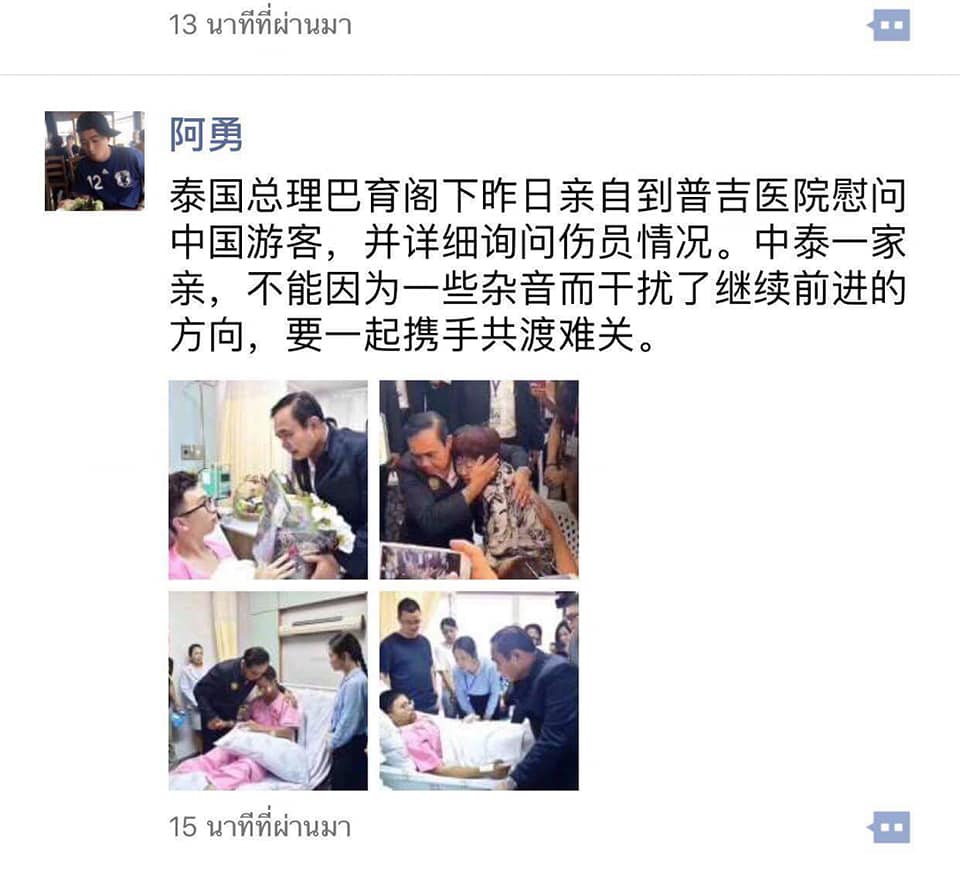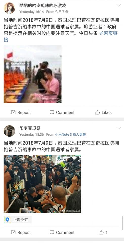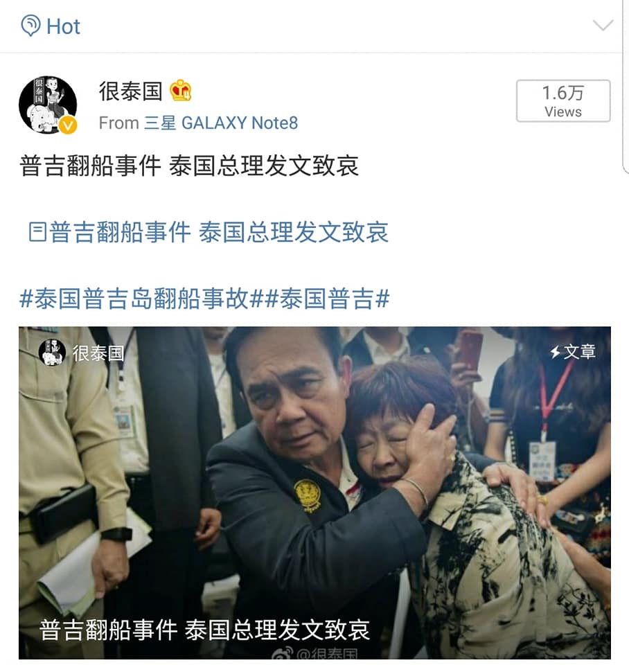 โซเชียลจีนเริ่มมีการแชร์และโพสต์รูป+เนื้อหาข่าวการลงพื้นที่และช่วยเหลือผู้ประสบเหตุเรือล่มที่จ.ภูเก็ต ของพลเอกประยุทธ์ นายกรัฐมนตรีของไทย