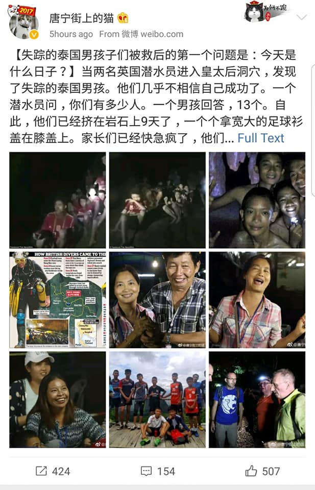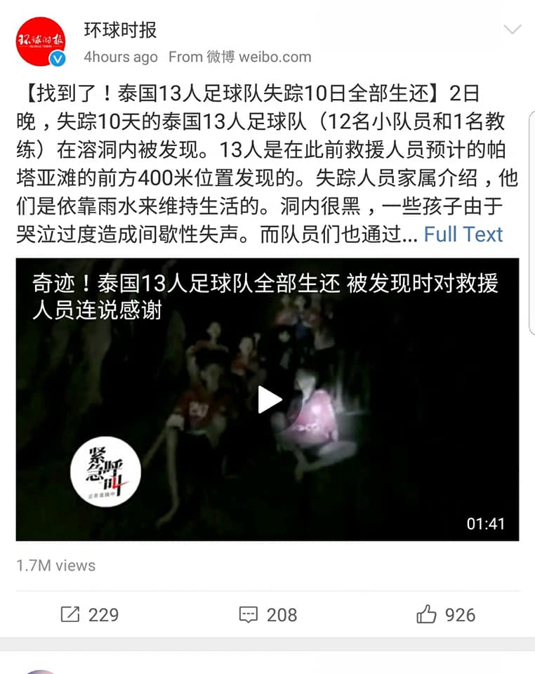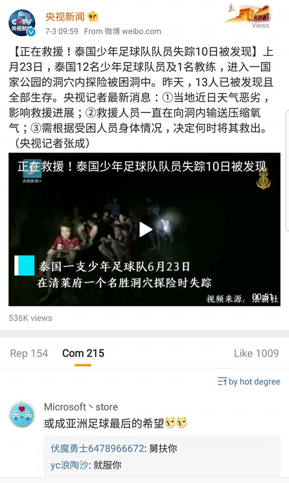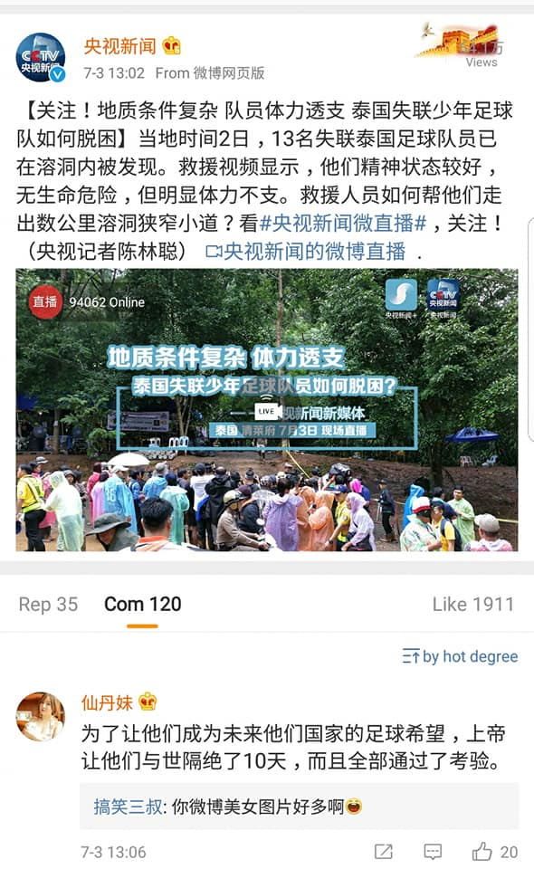 สื่อหลักของจีนอย่าง CCTV ยังคงติดตามข่าว “ช่วยเหลือ13ชีวิต ทีมหมูป่าออกจากถ้ำหลวง” อย่างใกล้ชิด โดยมีคนจีนดู Liveสดมากกว่าแสนคน (ภาพแรก จะเห็น10.6万 คือ 106,000 คน)