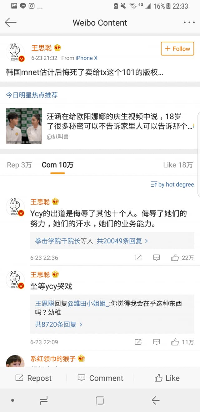 ดราม่าเกิดขึ้นหลังจากประกาศผลการประกวดเฟ้นหาศิลปินหญิงเกิร์ลกรุ๊ปรายการดังของจีน Produce101 เมื่อ หวังซือฉง ลูกชาย หวังเจี้ยนหลิน มหาเศรษฐี เจ้าพ่อธุรกิจอสังหาริมทรัพย์คนดังของจีน เจ้าของ Wanda Group ออกมาโพสต์ผ่านWeiboตนเองในทำนองที่ว่า