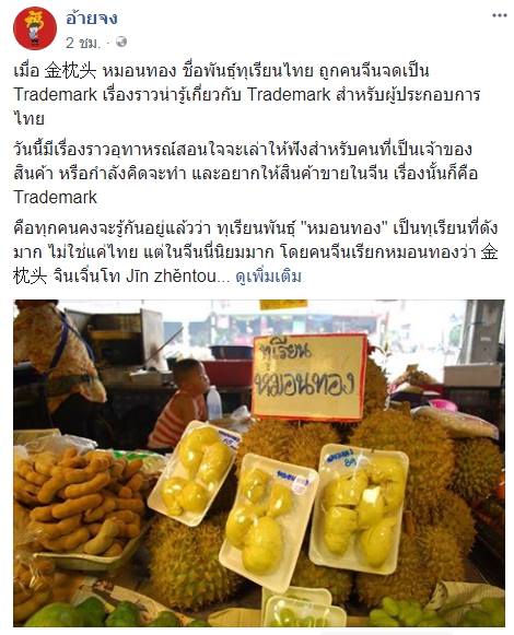 สำหรับประเด็น ทุเรียนหมอนทอง ที่อ้ายจงได้นำเสนอไปก่อนหน้านี้ (https://www.facebook.com/aizhongchina/posts/1192550080876553) ตอนนี้ทางรัฐบาลไทยได้ชี้แจงผ่านเว็บไซต์รัฐบาล โดยระบุว่า มีการตรวจสอบเบื้องต้นไปที่จีน พบว่า ผู้ประกอบการหลายรายของจีนมีการจดชื่อ 金枕头 (ทุเรียนหมอนทอง) จริงตามที่เพจอ้ายจงได้นำเสนอข้อมูล