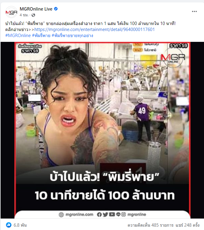 จากกรณี "พิมรี่พาย" สร้างรายได้ 100 ล้านบาท ใน 10 นาที สู่วงการ Live …27 พฤศจิกายน 2021จากกรณี "พิมรี่พาย" สร้างรายได้ 100 ล้านบาท ใน 10 นาที สู่วงการ Live สด ขายสินค้าในจีน ตลาดใหญ่ระดับใกล้แตะ 2 ล้านล้านหยวน . เห็นกรณีของ "พิมรี่พาย" บ้านเรา ทำให้ผมนึกถึงกรณีของ KOL (Key Opinion Leader) จีน เลย เลยขออนุญาตเล่าเรื่…